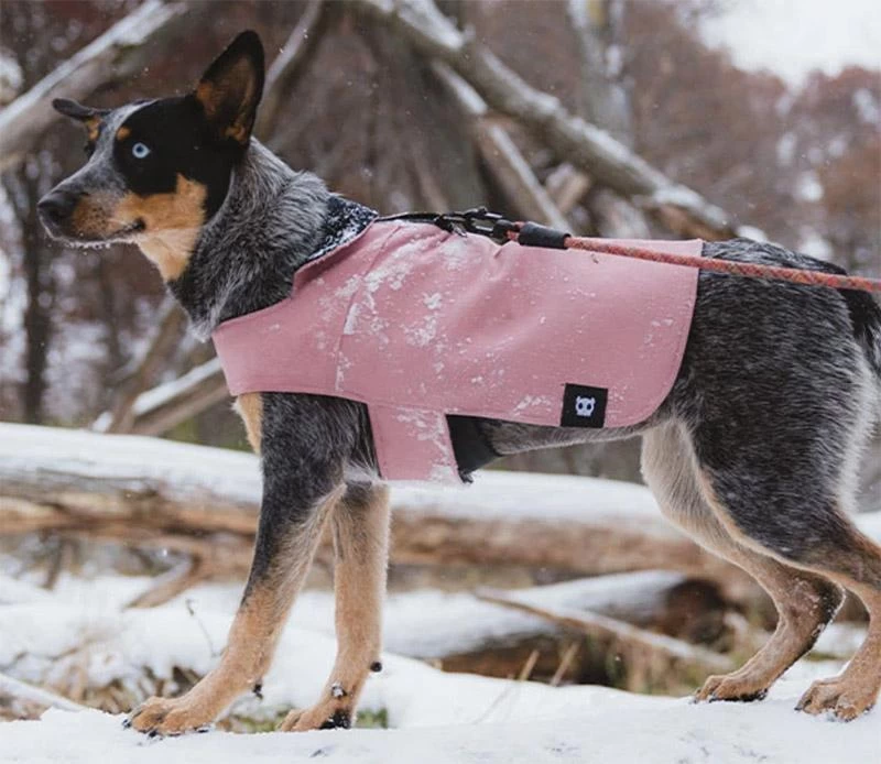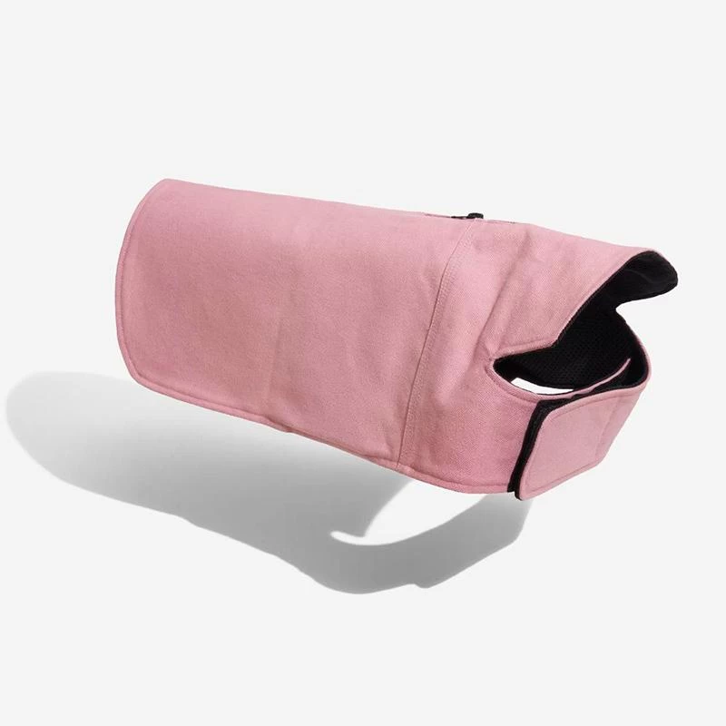 The Pink Coat for dogs is made from cotton duck fabric with a mesh padding inside and soft corduroy around the neck. This dog coat is adjustable and has velcro straps that make putting on and taking off the coat quick and easy. The coat also has a zipper on top to easily access a harness d-ring below.